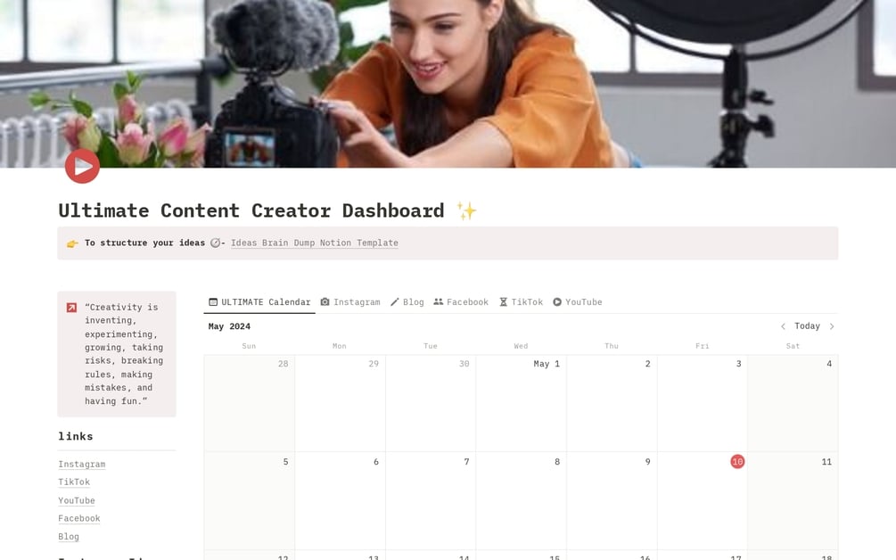 Take your content creation process to the next level with this Notion Content Creator Dashboard—an all-in-one tool designed specifically for creators. Whether you’re managing a YouTube channel, blog, podcast, or social media accounts, this template is the perfect solution for staying organized, boosting productivity, and tracking progress.